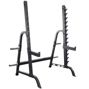 Designed with an extra-wide 4-point stance, the GPR370 is a rock-solid performer that features a 7° reverse pitch that accommodates your body's natural lifting path. Lift-off and safety positions are right where you want the so racking the bar is always comfortable and predictable. Perform squats, calf raises, lunges, dead-lifts, upright rows, and many, many more power building exercises. For increased workout capacity, add any freeweight bench and do bench, incline, decline, and shoulder press routines. If you are looking to bulk up and build power, or simply to tone your muscles and increase performance, the Multi-Press Rack is definitely the foundation of the ultimate freeweight system.