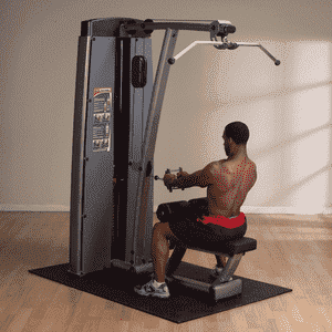 Body-Solid's Pro•Dual Lat Pulldown with Mid Row Machine is engineered with a high pulley directly overhead for optimum back and shoulder isolation. The extra long pull down bar permits wide, medium or narrow handgrip position.