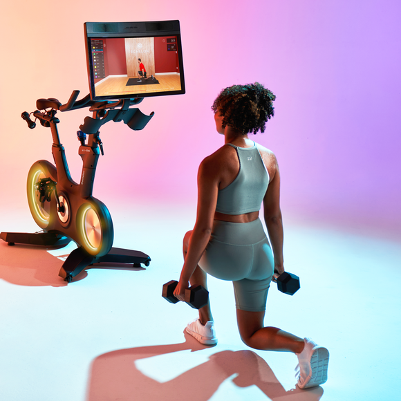 The curved touchscreen features a 180-degree flip rotation for access to daily live classes and thousands of on-demand cross-training workouts like Cardio, Arms+Abs, Kickboxing, Strength Training, Yoga, Pilates, and more.