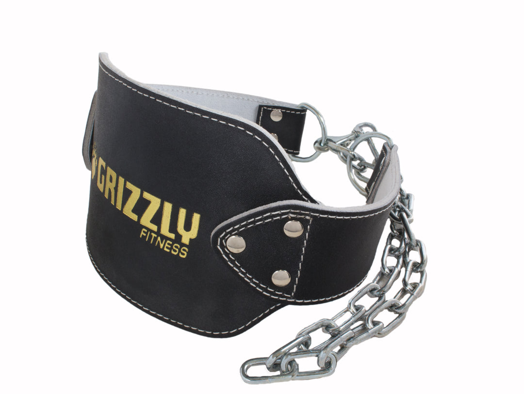 Grizzly Fitness Leather Dip, Pull Up and Chin Up Belt for Weight Lifting, Weight Training and Body Building by Men and Women | Used by Pros | Thick Multi-Ply Leather Construction with Reinforced Double Stitching for Extra Durability | Solid Steel 36" Chain with D-Ring and Snap Closure | Wide Soft Leather for Comfort during heavy lifts | One-Size