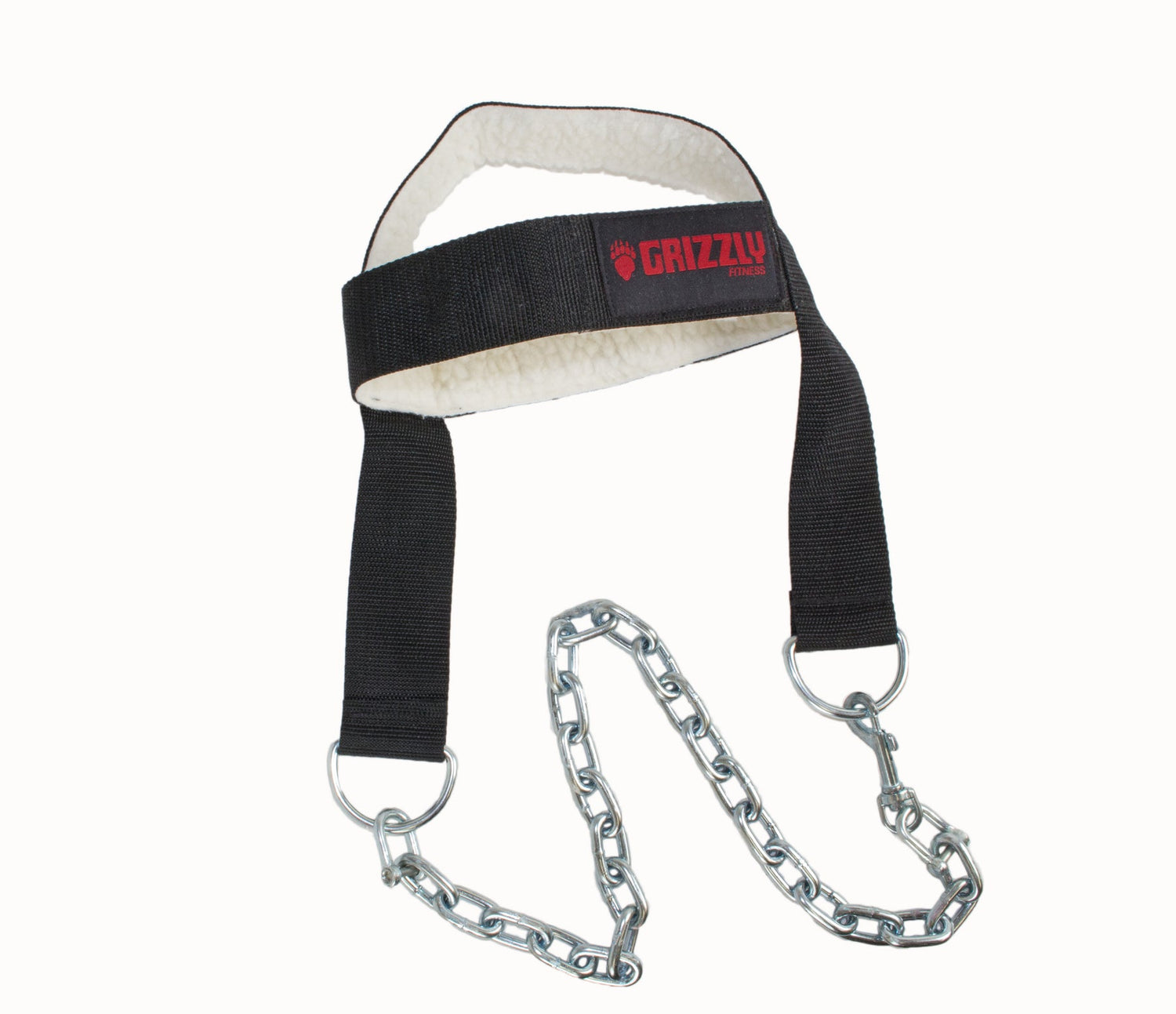 Grizzly Fitness Premium Nylon Head Harness for Weight Training by Men and Women | One-Size Fully Adjustable | Used by Pros for extra Comfort to increase Max | Durable stitched nylon with soft Borg Padding | 24" Steel Chain with D-Ring and Snap Attachment