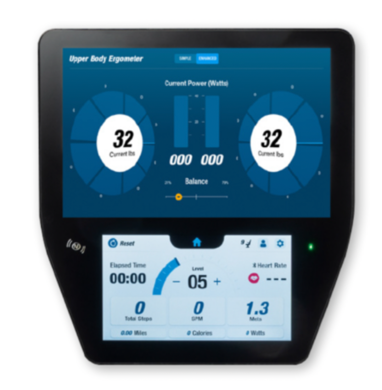 The UE8PRO upper body ergometer features a swivel drive train that supports access to exercise from three positions.