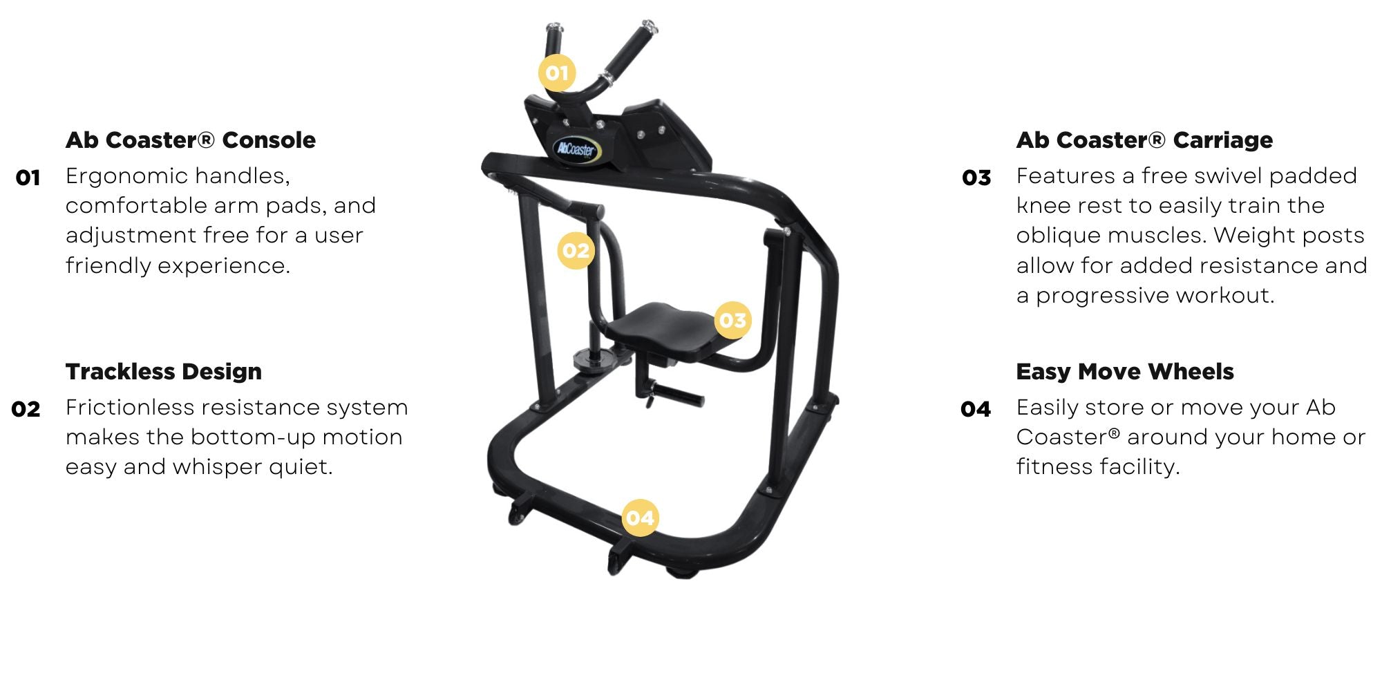 The unique design of the patented Ab Coaster® CTL features the patented Ab Coaster® bottom-up movement without rails. The trackless CTL design features a frictionless resistance system making the motion very easy for any user, as well as making for easy maintenance and whisper quiet operation.
