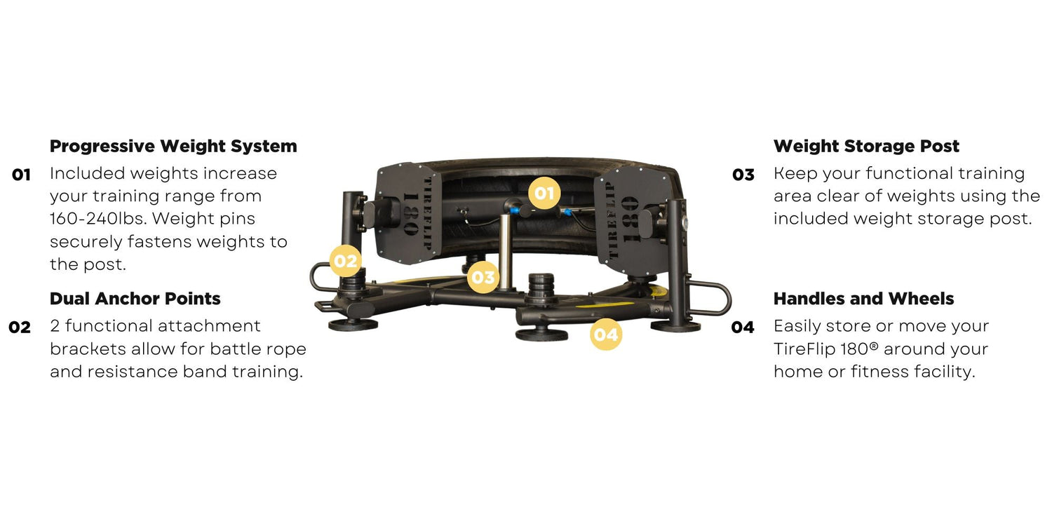 The patented TireFlip 180® XL is an innovative functional training system that gives you all the benefits of tire training in a safe, space-saving design. Flipping is just the beginning. Perform hundreds of exercises including strength, power, and agility in only 4x5 feet of space.