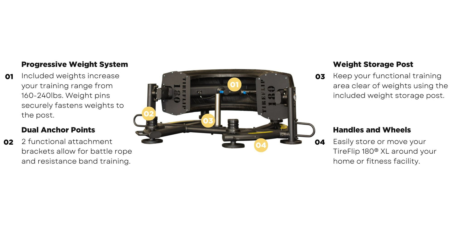 The patented TireFlip 180® XL is an innovative functional training system that gives you all the benefits of tire training in a safe, space-saving design. Flipping is just the beginning. Perform hundreds of exercises including strength, power, and agility in only 4x5 feet of space.